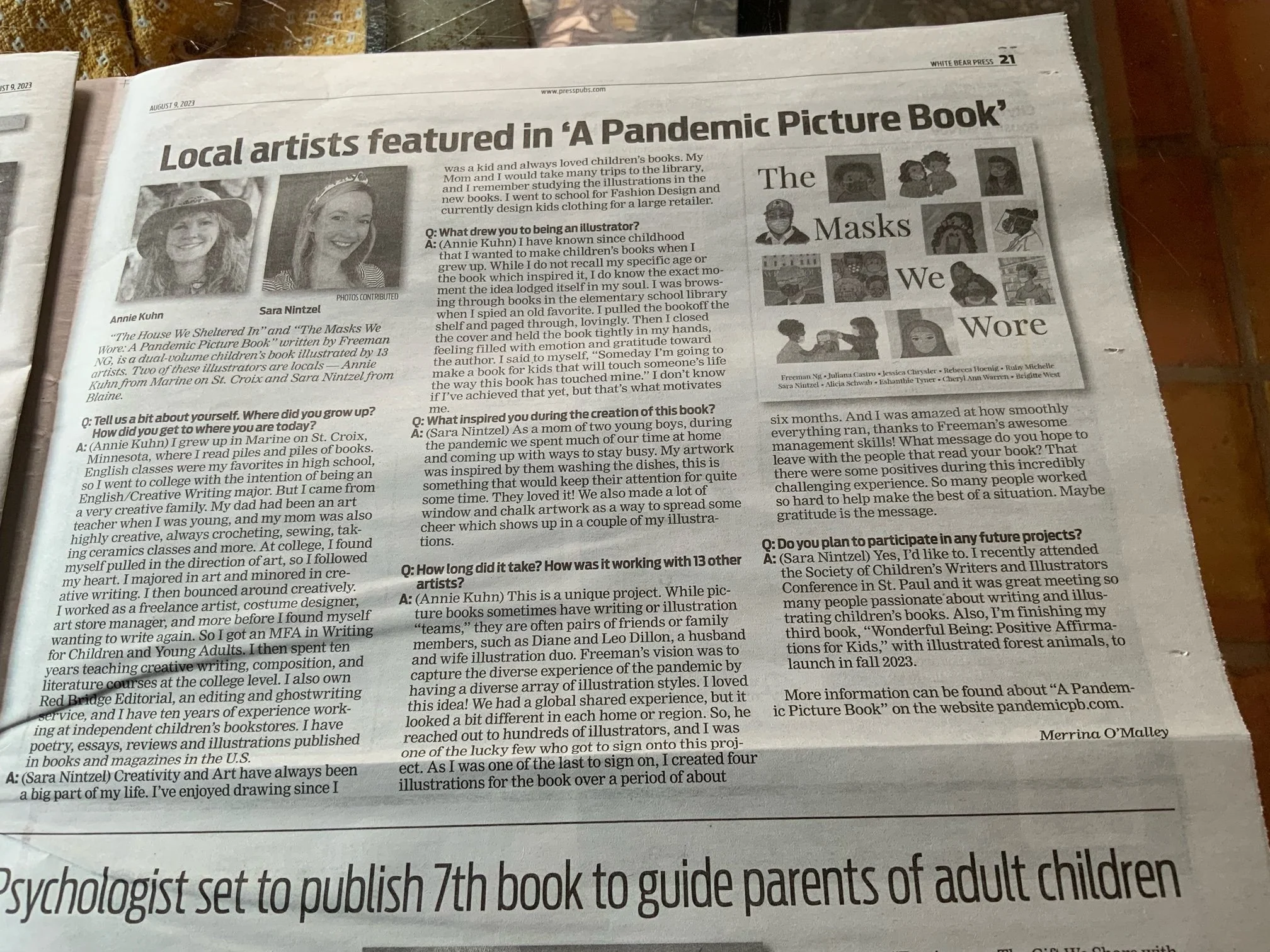 August 9, 2023: Fellow illustrators Annie Kuhn and Sara Nintzel are featured in the White Bear Press paper on our picture book, THE HOUSE WE SHELTERED IN / THE MASKS WE WORE.
